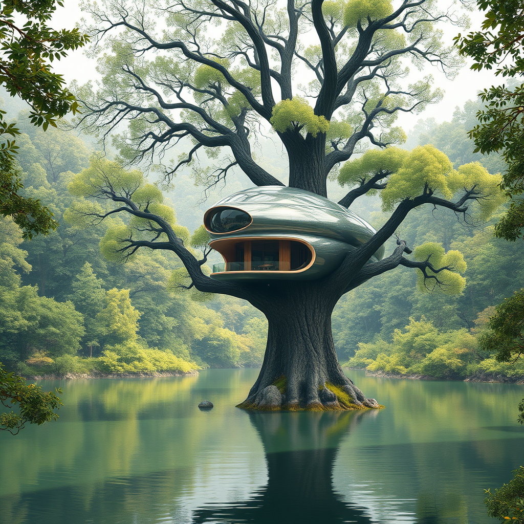 A stunning futuristic tree house by a visionary German architect nestled in a colossal tree, situated on tranquil waters within a vibrant and lush green forest. The design boasts intricate and mesmerizing details, evoking a sense of disbelief at its beauty. Rendered in the style of Filip Hodas and Bo Bartlett, the scene is captured in breathtaking 8k Ultra HD, blending organic minimalism with hyper-realistic artistry. Towering over its serene surroundings, this architectural marvel harmonizes seamlessly with nature, creating a dreamlike sanctuary in an otherworldly setting.