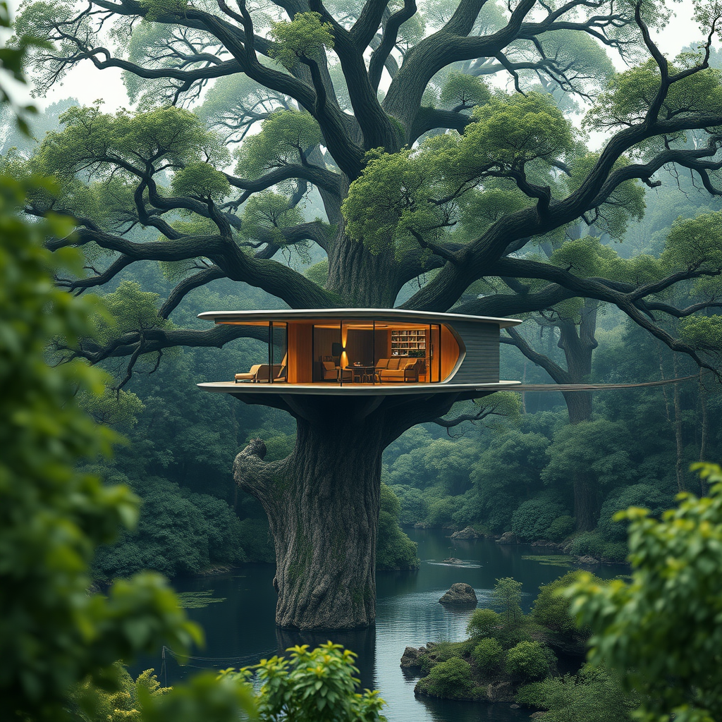 A stunning futuristic tree house designed by a visionary German architect, perched gracefully in a colossal tree over serene waters in an enchanting lush green forest, featuring awe-inspiring intricate details that captivate the senses, rendered in the distinctive style of Filip Hodas and Bo Bartlett. The scene is captured in breathtaking 8K ultra-high-definition, showcasing an organic minimalism with hyper-realistic elements, encapsulating the harmonious blend of nature and innovation in an awe-striking visual masterpiece.