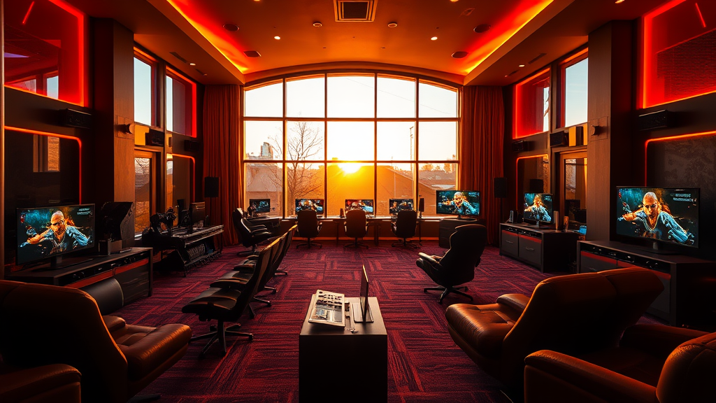 A stunning gaming room bathed in warm, cinematic lighting as the evening light filters softly through large windows, casting an enchanting glow across sleek gaming consoles and plush seating, creating an inviting atmosphere for immersive play.