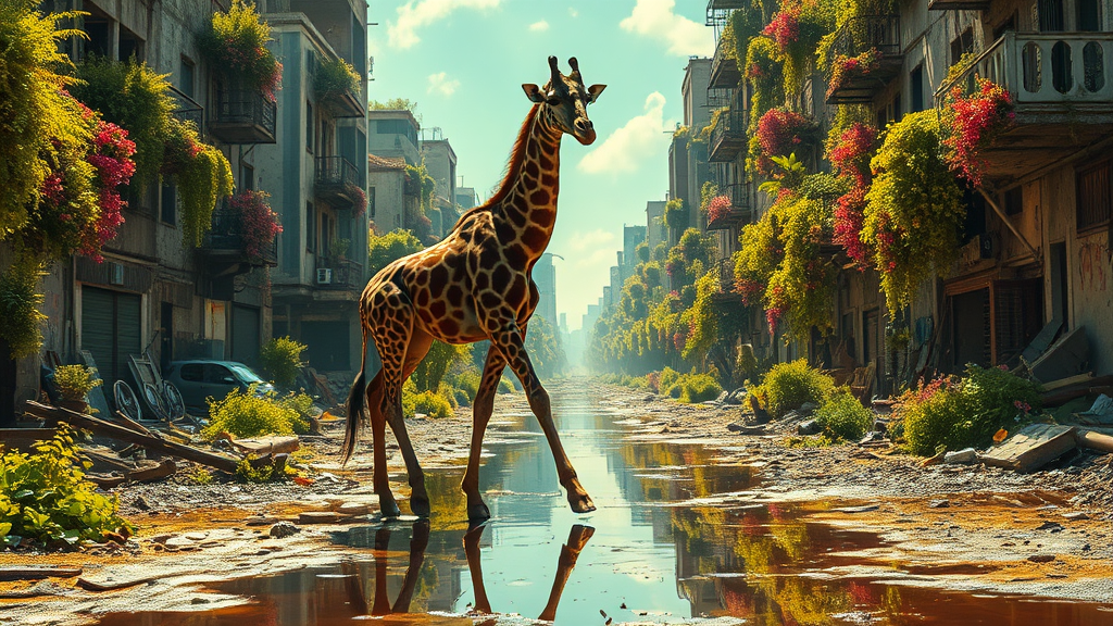A stunning giraffe with a blue head wanders through a dystopian post-apocalyptic cityscape, teeming with vibrant overgrown vegetation. The urban ruins are awash with rich, vivid colors as sunlight spills over the scene, casting cinematic shadows and highlights. Despite its disfigured appearance, the giraffe moves gracefully, its reflection captured in the shimmering puddles that dot the crumbling streets. The highly detailed and realistic imagery captures the juxtaposition of nature reclaiming this forgotten world, with an 8k octane-rendered finish that brings the surreal, beautiful chaos to life.