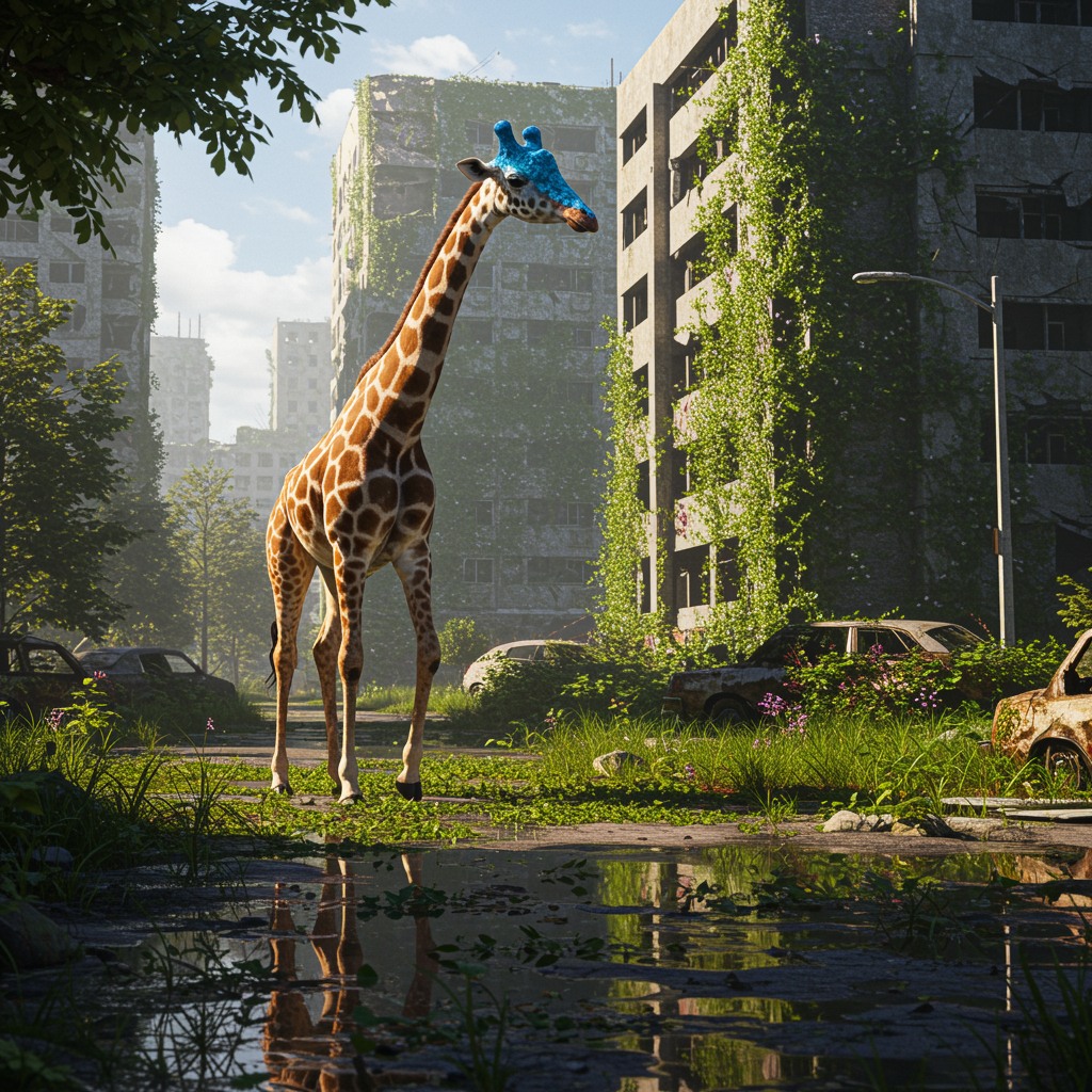 A stunning giraffe with a unique blue head, subtly disfigured, wanders through a dystopian post-apocalyptic city vibrant with overgrown vegetation. The remnants of human civilization are bathed in bright sunlight, casting cinematic shadows across the streets. Reflective puddles scatter across the ground, mirroring the surreal blend of urban decay and thriving nature. The cityscape is rendered in exquisite detail, capturing the contrasting textures of crumbling buildings and lush greenery. The scene is lifelike and vibrant, as though viewed through a highly realistic, 8k octane render, immersing the viewer in this futuristic yet eerily beautiful world.