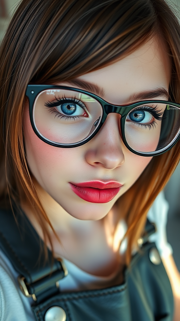 A stunning girl with captivating dark blue eyes and straight brown hair takes a selfie in portrait mode. Her stylish glasses complement her enchanting features—her pink lipstick accentuates her freckled face and beautiful lips, while a perfect thin nose enhances her charm. She wears trendy leather overalls in the early morning light. The photo captures sharp focus on her mesmerizing eyes, with a 1.4mm lens highlighting the beauty of her expression. The image subtly plays with imperfections and creativity, offering a unique twist to the conventional portrait by incorporating artistic symbolism.