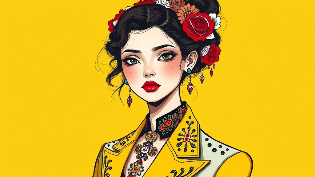 A stunning girl with delicate features, alabaster skin, dressed in a chic fashion suit adorned with vibrant, playful, and intricate embellishments featuring geometric patterns and designs. The minimalist painting style emphasizes bold contrasts with a Chelsea Yellow background. The color palette is primarily Chelsea Yellow, white, black, and red, focusing on flat illustrations. The minimalist fashion illustration is inspired by Memphis design aesthetics, showcasing a harmonious blend of simplicity and vivid artistic expression.