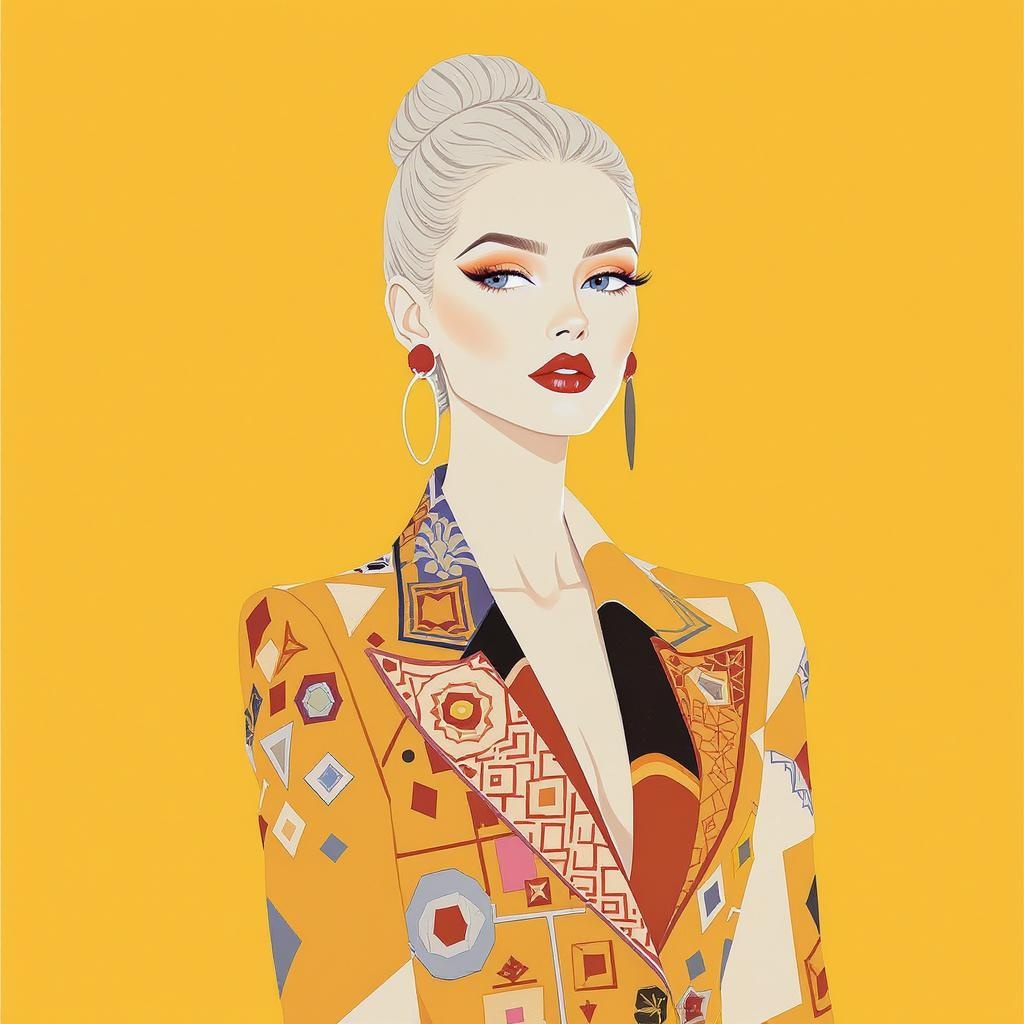A stunning girl with delicate features and alabaster skin wears a fashion-forward suit adorned with vibrant, intricate embellishments and geometric patterns. The design harmoniously blends minimalist painting style with the lively aesthetic of the Memphis movement. The background is a rich Chelsea Yellow, which also features prominently in her outfit alongside accents of white, black, and red. The illustration is flat and minimalist, focusing on bold lines and contrasts to highlight the playful yet sophisticated ensemble.