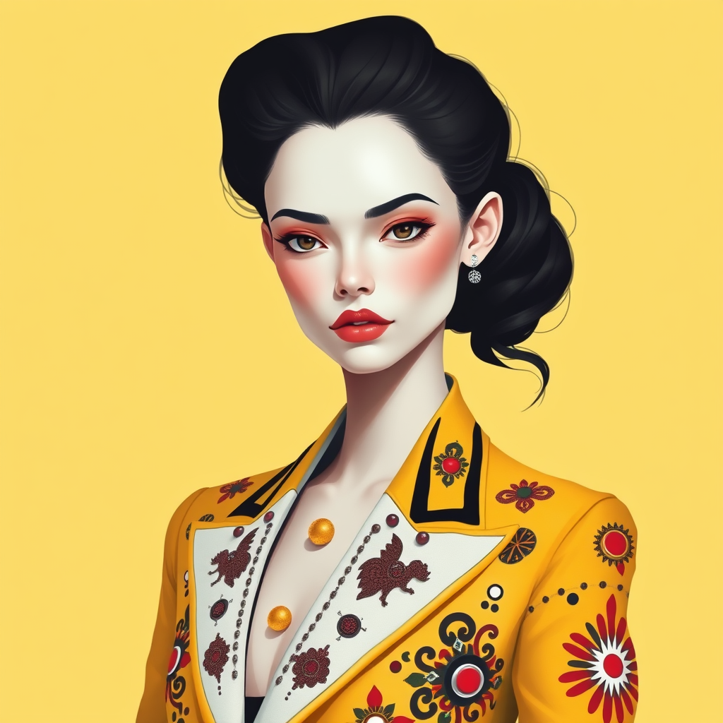 A stunning girl with delicate features and pale white skin, wearing a chic fashion suit adorned with vibrant and intricate embellishments and geometric patterns. The minimalist painting style features a Chelsea Yellow background, with a color palette centered around Chelsea Yellow, white, black, and red. The flat illustration style embodies minimalist fashion with a touch of the Memphis design movement, emphasizing simple yet striking composition.