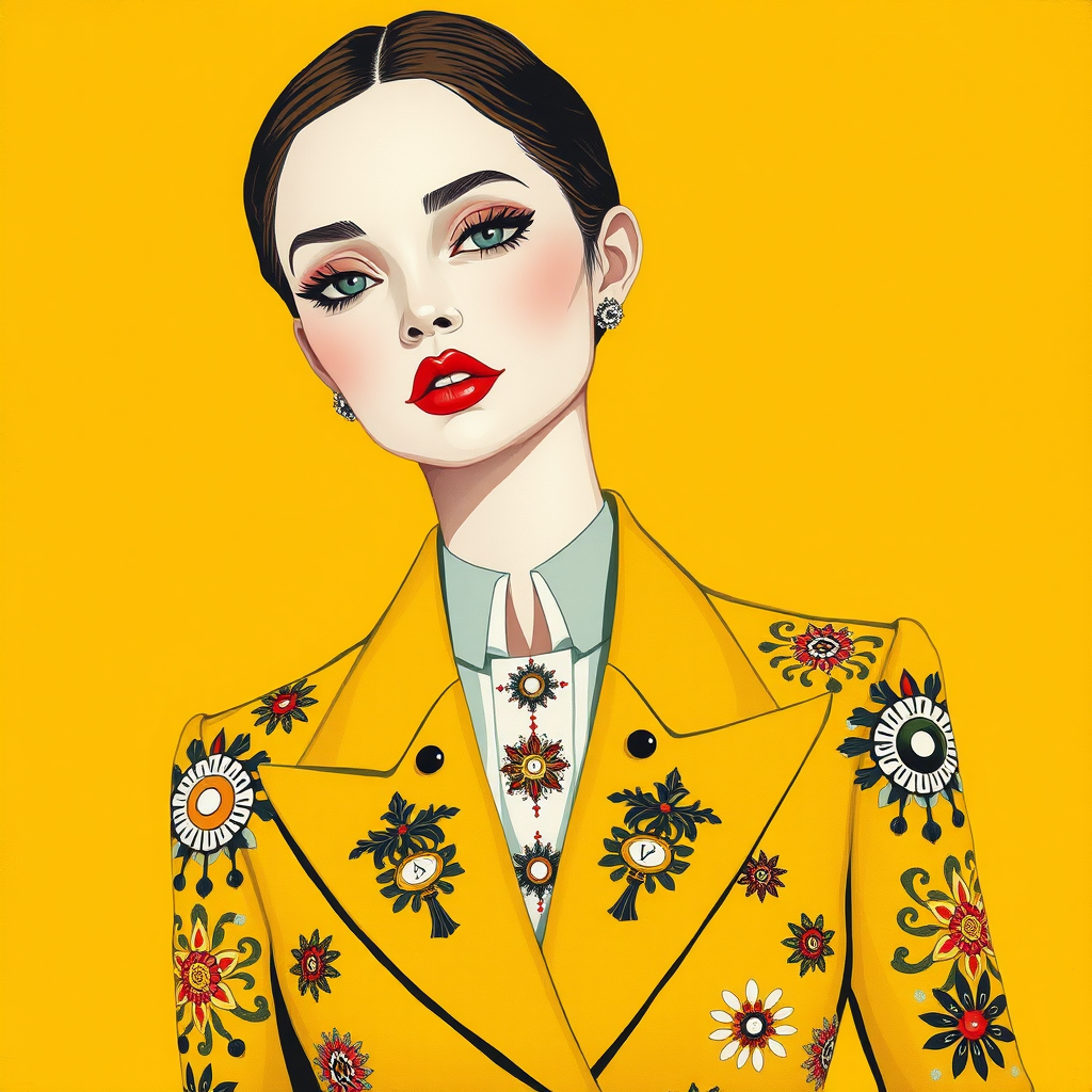 A stunning girl with delicate features and pale white skin wears an elegantly tailored fashion suit adorned with colorful and playful intricate embellishments, featuring geometric patterns and designs. The minimalist painting style emphasizes Chelsea Yellow as the backdrop, complemented by a harmonious palette of Chelsea Yellow, white, black, and red. The illustration employs flat, minimalist aesthetics reminiscent of the Memphis art movement, highlighting the fashion-forward fusion of classic and whimsical elements in her appearance.