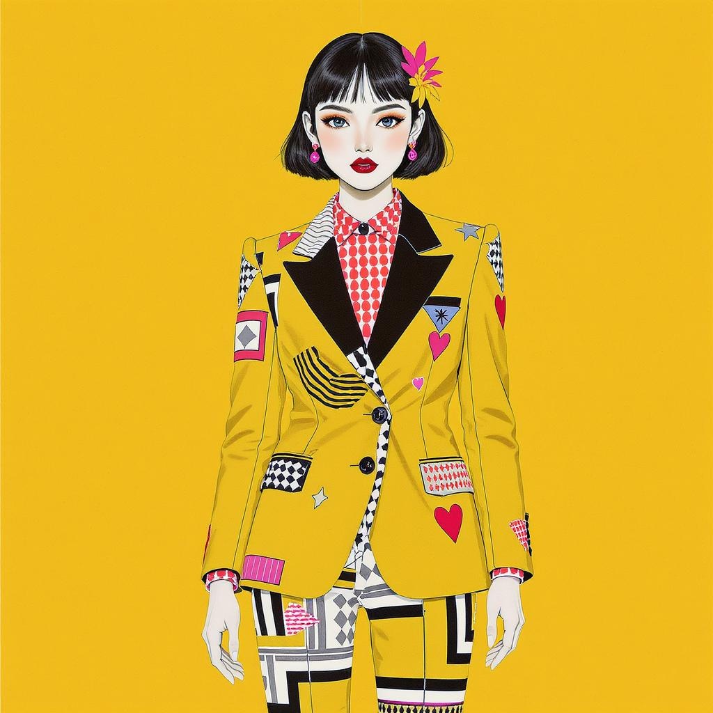 A stunning girl with delicate features and pale white skin, adorned in a fashion suit with vibrant and playful embellishments and geometric patterns. Her ensemble is a blend of minimalist and Memphis-inspired styles with a color palette predominantly featuring Chelsea Yellow, accented by bold black, white, and red. The illustration is a flat minimalist fashion portrayal, set against a Chelsea Yellow background, capturing a sense of modern elegance and artistic flair.