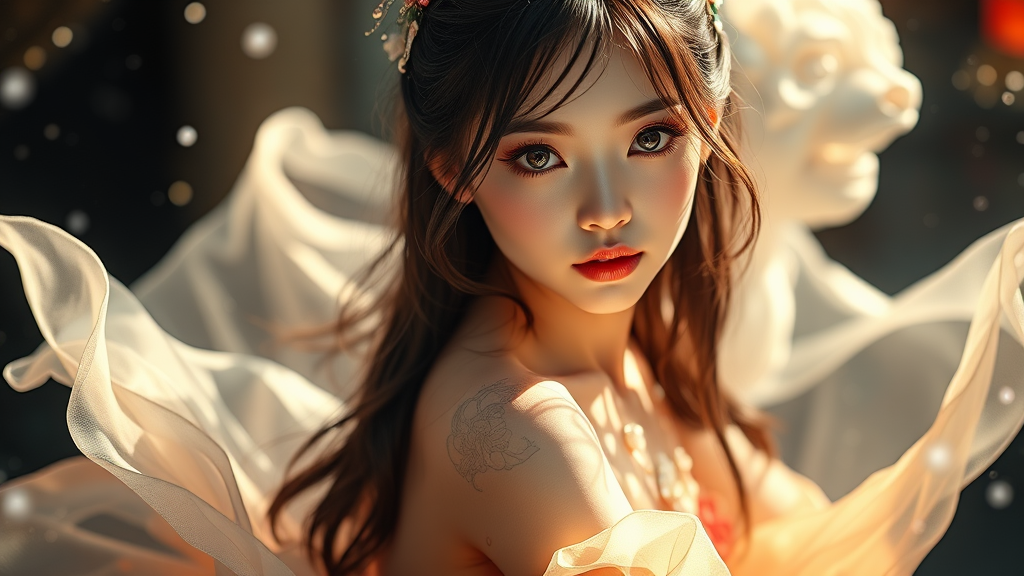 A stunning girl with delicate features, possessing large silver eyes and pale, porcelain skin. She is adorned in a gauzy skirt, showcasing her slender legs. With distinct Chinese beauty, she exudes a high brightness, shimmering with a pearly hue. Captured in dynamic poses and angles, she emanates an aura of mystery and fantasy, as if surrounded by magic. The scene is high quality and ultra detailed, with a luminous and enchanting essence.