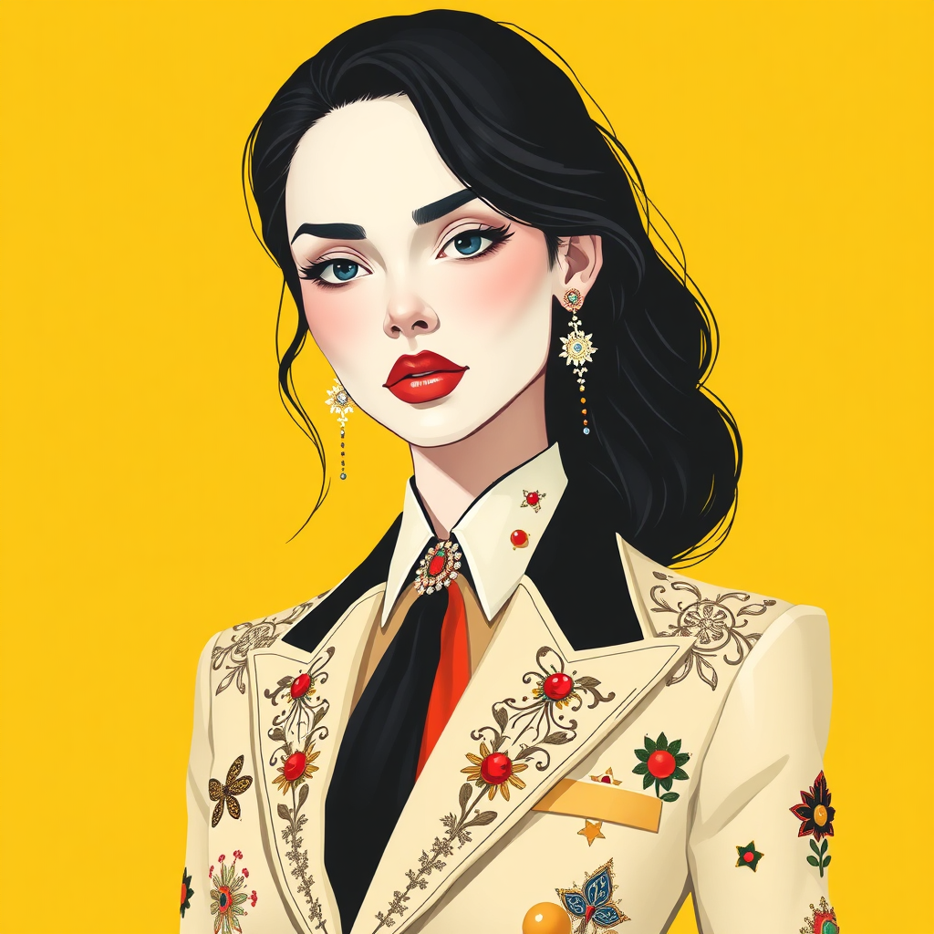 A stunning girl with elegant features and porcelain white skin, dressed in a stylish suit adorned with intricate, playful embellishments and geometric designs, all in a minimalist painting style. The background is Chelsea Yellow, perfectly complementing a color palette of Chelsea Yellow, white, black, and red. This flat illustration captures a minimalist fashion look within a Memphis-inspired aesthetic.