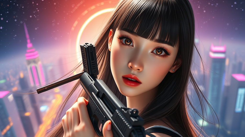 A stunning girl with flat bangs and a 3D, beautifully symmetrical face gazes at the viewer. Her features echo a blend of K-pop idol and supermodel qualities, with a flawless complexion and glowing eyes that suggest an ethereal goddess. Her skin shows natural texture and a subtle shine, complementing her white, clear skin tone. Her delicate face captures a perfect harmony with a golden ratio, adorned with expressive eyes and long eyelashes. Her luscious, glossy lips carry a touch of natural makeup. She boasts a slender figure with perfect proportions, including a medium bust, slim waist, and legs, embodied in an adventurous stance. Her very long, shiny hair flows with the wind, adding to her allure. She holds a gun, her adventurous look enhanced by a futuristic cityscape and neon lights behind her. The scene is set against a starry sky, colorful refractions, and a wormhole world, evoking a science fiction realm. Cyberpunk aesthetics abound, with extremely metal textures and pixel art influences, all wrapped in Rembrandt lighting and space warp fog, capturing a sense of exploration and wonder.