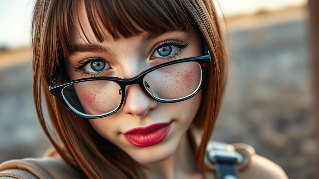 A stunning girl with striking dark blue eyes and straight brown hair takes a selfie in portrait mode. Her lips, adorned with pink lipstick that highlights their natural texture, complement her freckled face. Her perfect, slender nose and stylish glasses add to her captivating beauty. She dons chic leather overalls in the early morning light. The focus is sharp on her enchanting eyes, captured with a 1.4mm lens. While maintaining the essence of the moment, creative elements include a slightly whimsical expression and the gentle play of light on her features.