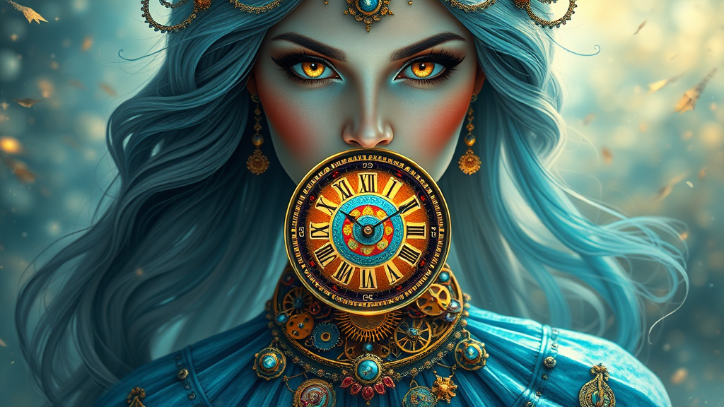 A stunning goddess known as the Lady of Time, she exudes an aura of ethereal beauty and grace as she controls the passage of moments. Her face is a captivating masterpiece, framed by striking light golden eyes that seem to hold the secrets of eternity. She wears an exquisite gradient blue dress adorned with the intricate elements of internal clockwork parts, each piece symbolizing the ticking of time. At the center of her dress, a vibrant, mesmerizing fractal clock radiates magic with its elaborate and colorful design. The metallic details scattered throughout her attire shine with a delicate brilliance. The scene around her is a breathtaking blend of artistry, merging the emotive elegance of Gerhartz, the dynamic energy of Artgerm, and the surreal imagination of Dali. The backdrop unfolds like a dreamscape, painting a world both beautiful and intriguing. This high-definition, ultra-detailed portrayal captures every nuance, blending elements reminiscent of Dreamscapes & Dragonfire. Here, the imperfections of reality are left behind; there are no cloned faces or mutated features, only the impeccable vision of a timeless deity. The result is an image free from the distractions of modern visuals, with no logos, letters, or low-resolution artifacts to detract from its splendor.