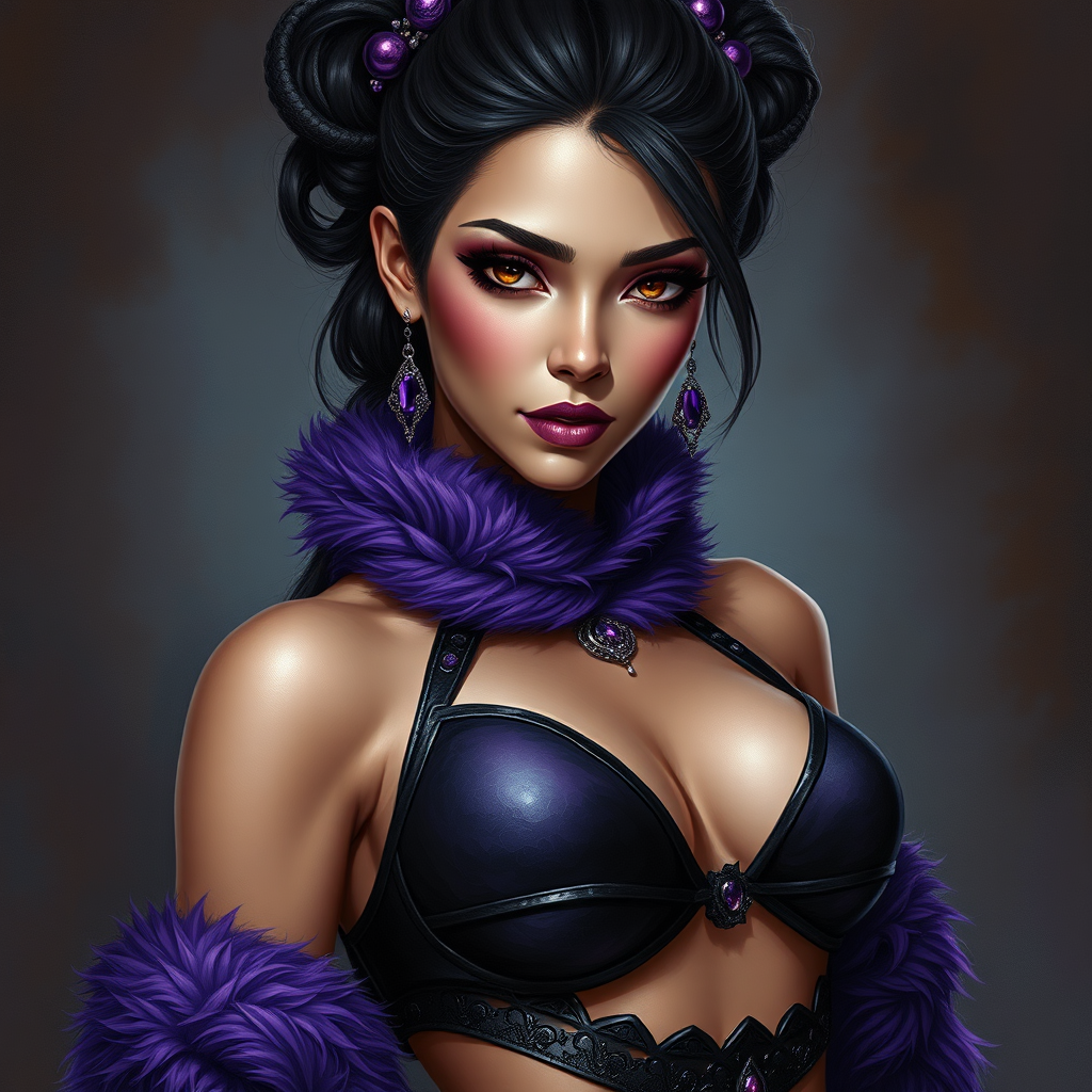 A stunning goddess-like woman inspired by Kitana, dressed in elegant purple and black attire with a touch of fantasy and gothic art style. Her attire features a short skirt, with the fabric complemented by luxurious textures reminiscent of a furry appearance. Her face is exquisitely perfect, with soft, flawless skin and striking features that capture a fantastical essence. The portrait, incorporating the artistic styles of Greg Rutkowski and Artgerm, showcases hyper-detailed and intricately designed elements, trending on art platforms for its masterful use of triadic and complementary colors. The artwork, a fantasy concept piece, boasts an impressive 8k resolution and a splash screen feel with oil painting techniques, bringing heavy strokes and Gothic themes together. While maintaining the fantastic and alluring core concept, the portrait avoids any distortions such as mutations or disproportions, ensuring a flawless depiction of this mesmerizing character.