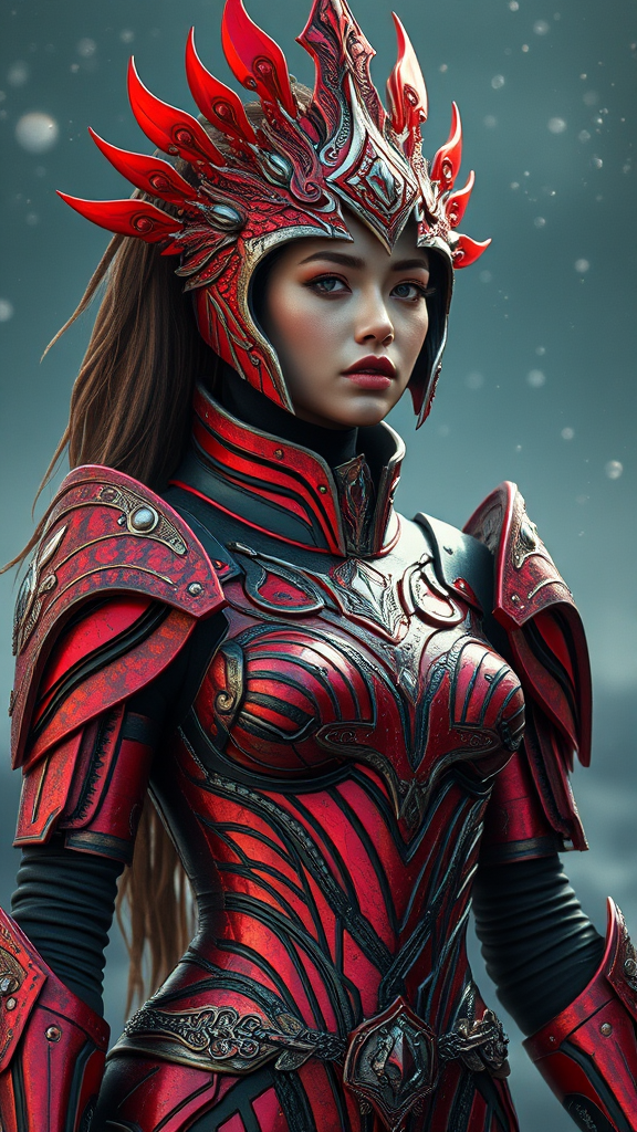 A stunning goddess warrior knight clad in beautiful futuristic space armor stands poised in a sci-fi setting. Her battle-worn, intricate red armor exudes decadence and divine celestial elegance. Capturing an ultra-realistic and hyperrealistic aesthetic, she embodies cinematic detail in her design. The scene is rich in texture, presenting a stunning yet gritty realism with a highly detailed focus. Despite the narrative of battle and endurance, her visage remains elegant within the cosmic expanse.
