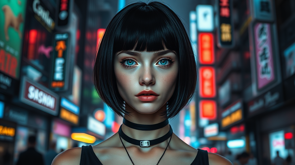 A stunning, high-quality image of a young woman with sleek black bob cut hair, her captivating mint eyes peering directly at the viewer. She stands alone, embodying the essence of cyberpunk style with subtle light freckles adding a touch of realism to her flawless complexion. A unique choker adorns her neck, enhancing her edgy appearance. The backdrop is a bustling dark cyberpunk cityscape, teeming with neon lights and futuristic architecture, amplifying the enigmatic atmosphere. The composition exudes a sense of intrigue and allure, inviting viewers to immerse themselves in this dystopian world.