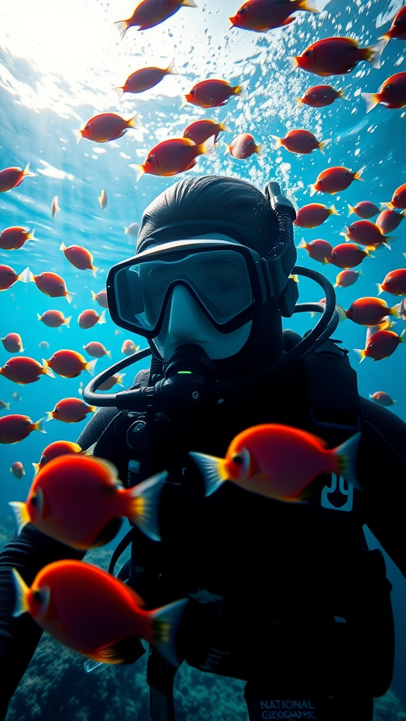 A stunning high-resolution underwater photograph features a scuba diver equipped with a mask and breathing regulator, immersed in an enchanting seascape filled with vibrant, multicolored tropical fish that seem to dance around them. The water is crystal clear, allowing rays of sunlight to penetrate and illuminate the scene with a magical glow. The diver's silhouette contrasts beautifully against the vivid hues of the fish, creating an exquisite balance of nature and exploration. This photorealistic image captures the awe-inspiring beauty and tranquility of underwater life, echoing the style and precision of a National Geographic masterpiece.