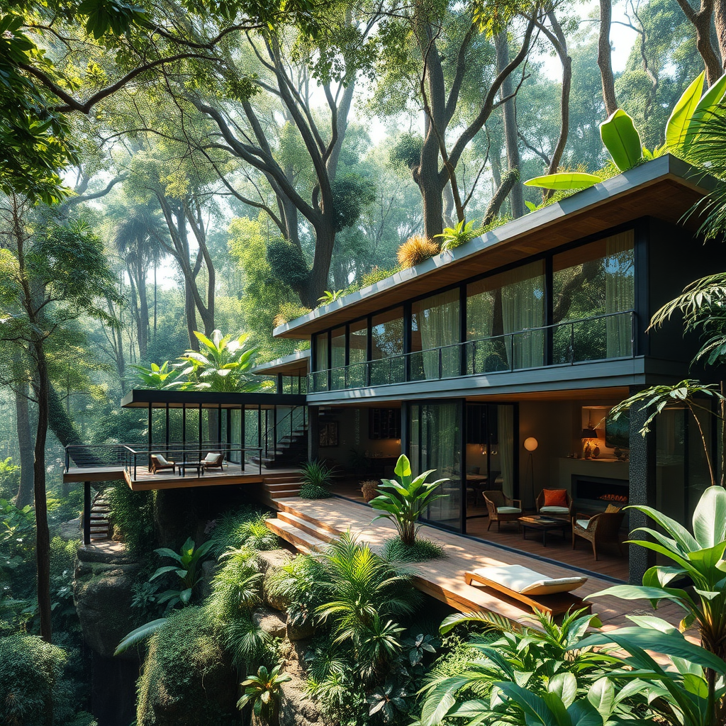 A stunning home designed in a contemporary tropical style seamlessly blending into the lush rainforest, featuring expansive glass walls and open spaces that invite nature indoors, where verdant foliage and organic materials create a harmonious living environment with vibrant greenery and sunlight streaming through the canopy, offering a serene escape deep within the tranquil embrace of the towering trees and rich vegetation.