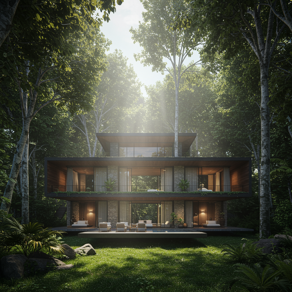 A stunning house nestled within a lush forest, designed in an exquisite tropical modernism style. Sunlight filters through the dense canopy, casting volumetric beams that illuminate the sleek, open-air architecture. The structure boasts expansive glass walls that invite the outside in, blending seamlessly with natural surroundings. A harmonious blend of wood, stone, and greenery accentuates the organic feel, while spacious terraces overlook the tranquil landscape. The overall ambiance is one of serene elegance, where contemporary design meets the untamed beauty of nature.
