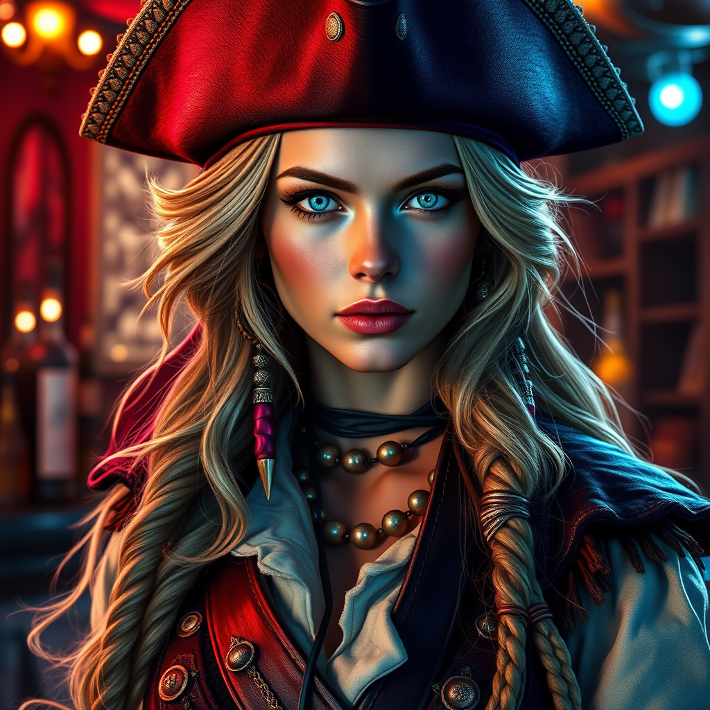 A stunning hyper-realistic digital painting of a beautiful 20-year-old blonde woman in pirate captain attire, exuding confidence and allure. Her intricate costume is adorned with detailed accessories and textures, showcasing a mix of traditional and unique pirate elements. Her long hair is a dynamic blend of random vivid colors, catching the light in mesmerizing ways. Her eyes are a captivating mix of random colors, adding an enigmatic allure to her expression. The composition portrays her full body, capturing her perfect anatomy and poise in a scene that speaks to her adventurous spirit. Her face is meticulously detailed, reflecting a harmonious balance of beauty and grit, with intense coloration adding depth and realism. The setting features luminism-inspired bar lighting, providing a dramatic contrast that enhances the intricate details of her clothing and features. The color scheme is realistic yet vibrant, drawing viewers into a fantasy world. The portrait is sharp and in focus, offering an award-winning quality with 16K resolution, ensuring every element is rendered in UHD and HDR for a breathtakingly vivid appearance.