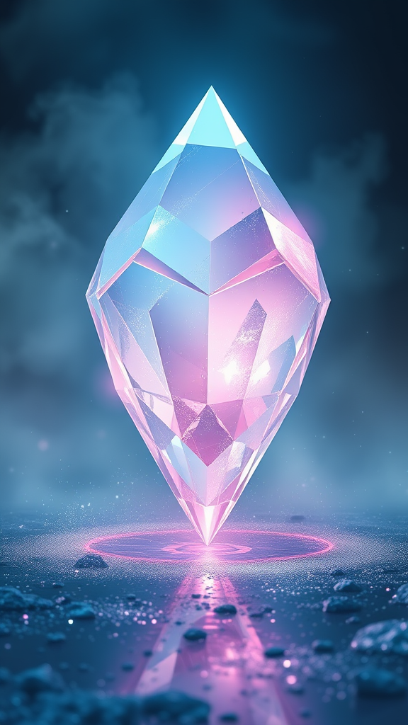 A stunning hyper-realistic image of a futuristic crystalline structure, its facets gleaming with an iridescent array of colors, reflecting a harmonious blend of soft neon blues and gentle pastel pinks. The crystal hovers gracefully within a surreal, misty landscape, where the ground shimmers with a metallic sheen and floating particles of light dance around it. Its sharp, angular edges contrast with the ethereal glow, hinting at advanced technology infused with nature's beauty. The atmosphere feels mysterious yet inviting, evoking a sense of endless possibilities and exploration in this fantastical future world.