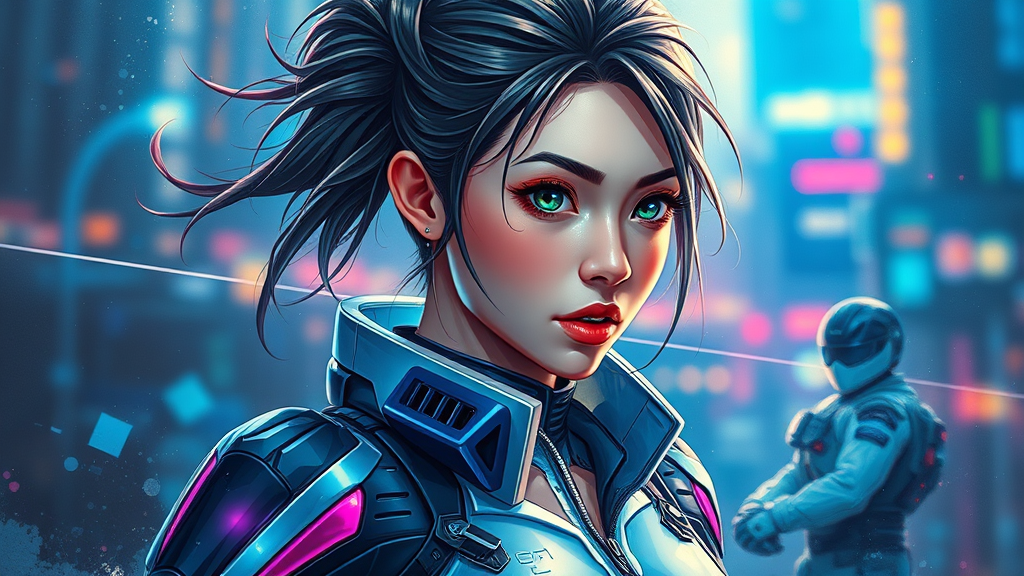 A stunning, hyper-realistic painting of a captivating young woman in a sleek, futuristic plugsuit, intricately detailed with vibrant colors and elaborate textures, inspired by the anime aesthetic. The artwork incorporates subtle sci-fi elements and emits a serene yet powerful aura. The scene captures a sense of motion, with dynamic lighting and shadows highlighting her features, evoking the signature style of Greg Rutkowski. It's a masterpiece that resonates with the art community, making waves on platforms like ArtStation, touching on themes of strength and grace.