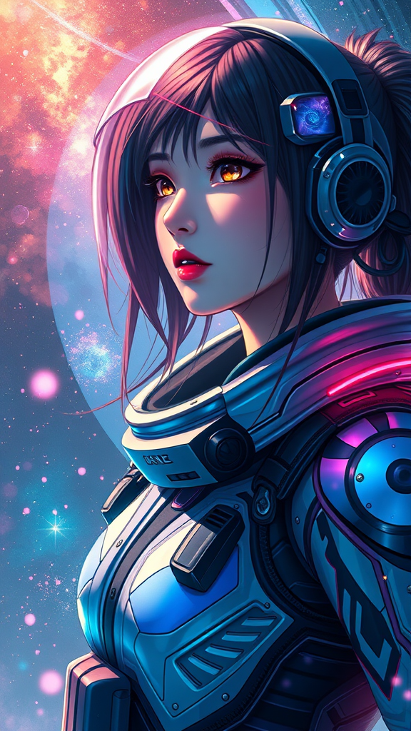 A stunning hyper-realistic painting of a captivating girl wearing a sleek EVA plugsuit, intricately detailed with vibrant colors and dynamic highlights, infused with anime aesthetics, reminiscent of the style of Greg Rutkowski. The artwork features futuristic elements, eye-catching textures, and an ethereal atmosphere, making it a trending piece on ArtStation. Subtle creative enhancements include a celestial backdrop with glowing nebulae and softly floating stardust, adding a sense of wonder and adventure to the composition while maintaining the core concept.