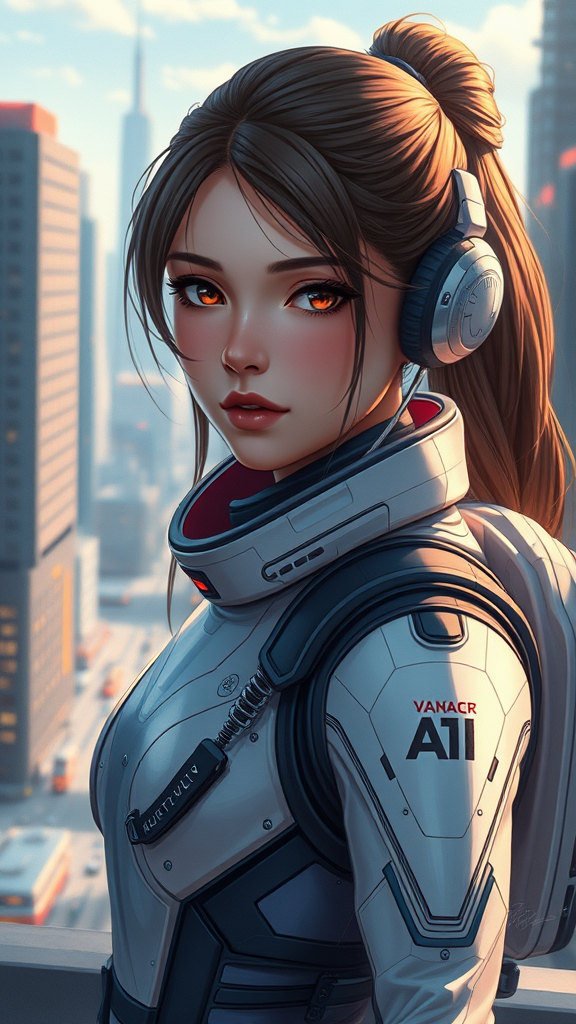 A stunning hyper-realistic painting of a captivating young woman dressed in a sleek EVA plugsuit, featuring intricate detailing and vibrant colors, in an anime style reminiscent of the works of Greg Rutkowski, with a futuristic cityscape in the background, trending on ArtStation, her eyes reflecting a sense of determination and wonder, surrounded by soft ambient lighting that casts gentle shadows, capturing the essence of a sci-fi adventure.
