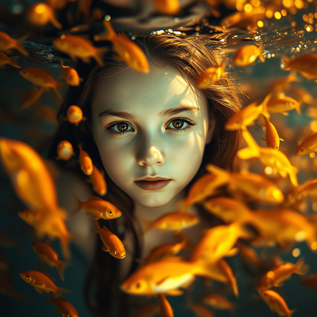 A stunning hyper-realistic photograph captures a girl submerged underwater, surrounded by a mesmerizing dance of golden fish. The close-up shot immerses you in a dreamlike atmosphere, with the enchanting interplay of bokeh reflections casting ethereal patterns around her. Soft, golden-hour lighting accentuates her face, creating a halo effect that highlights her serene expression. The scene exudes an astounding beauty that feels almost unbelievable, with the vibrant colors of the fish shimmering like liquid gold in the gentle currents. The composition balances chaos and calm, drawing you into its spellbinding allure.