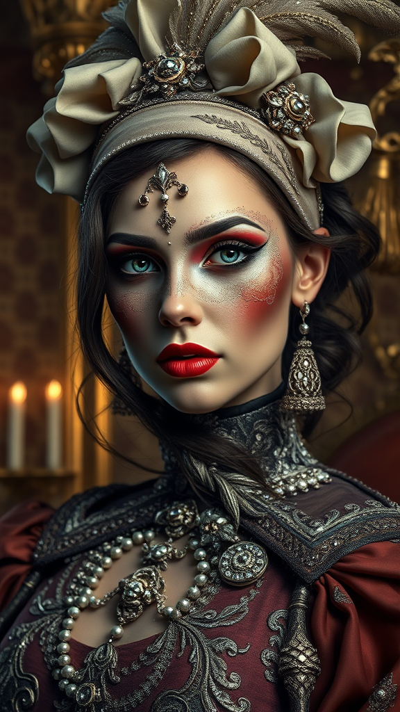 A stunning hyper-realistic portrait of a woman inspired by the Venetian carnival, captured in the style of an oil painting by Gerald Brom. Her strikingly detailed features are highlighted against the opulent backdrop, with intricate textures and colors reflecting the grandiosity of the festival. The absence of a mask reveals her captivating expression, blending elegance and mystery. Her elaborate attire, adorned with shimmering embellishments, is rendered with ultra-detailed precision, reminiscent of the craftsmanship of Unreal Engine, showcasing a convergence of fantasy and realism.