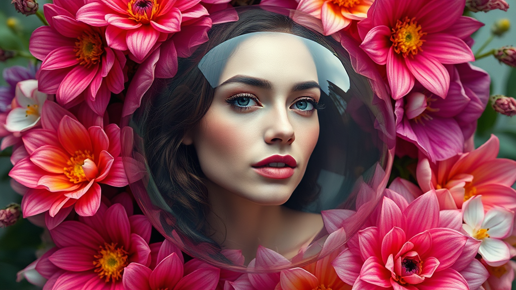 A stunning hyperrealistic depiction of a woman encapsulated in a transparent glass sphere surrounded by vibrant, colorful flowers, with incredible attention to detail and clarity, capturing the essence of nature's beauty in sharp focus, in breathtaking 4k resolution.