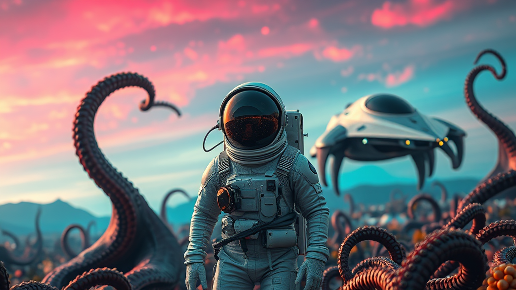 A stunning, hyperrealistic image of an intrepid space explorer in an alien landscape, featuring intricate details of looming tentacles and pulsating internal organs against a vividly colored alien sky. A sleek spaceship hovers in the background, its metallic surface glistening in the Ultra-HD light. The explorer is caught in a scene of scientific awe, surrounded by superfine details highlighting the drool dripping from the tentacles and the ambient reflections on their space suit, captured in 8K for ultimate clarity and depth.