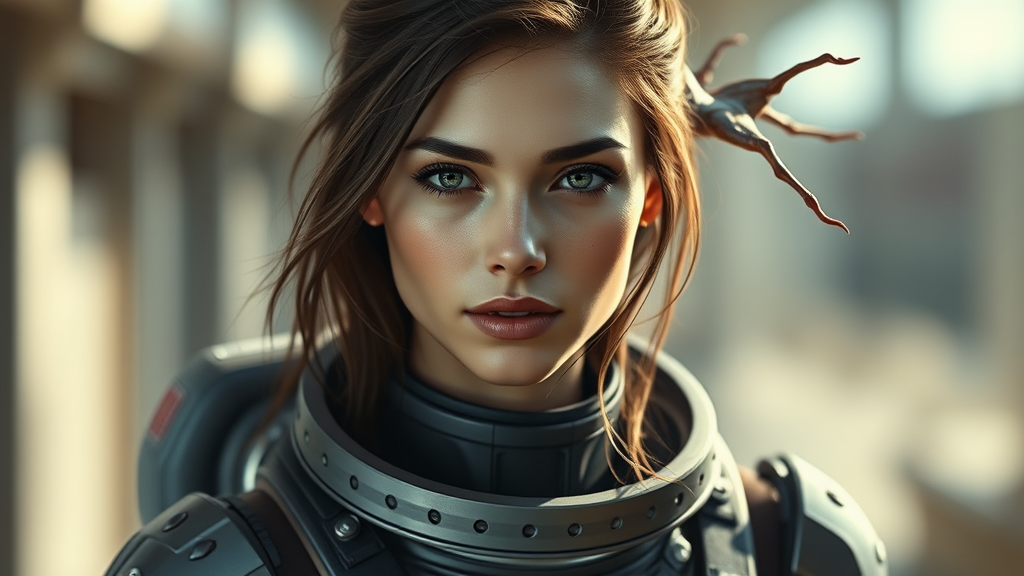 A stunning hyperrealistic painting of a beautiful young woman wearing an EVA plugsuit, captured in a full-length portrait. Her face is exquisitely detailed and gorgeous, framed by locks of hair that fall gracefully around her shoulders. The plugsuit is intricately designed, providing a skimpy yet sleek look with elements of armor that contour her figure. The artwork, influenced by Greg Rutkowski's style, exhibits hyperrealism with impeccable character design and concept art techniques. Depth of field adds a cinematic quality, with striking light and shadow play accentuating her form. However, anomalies appear in the form of disjointed anatomy—extra limbs, floating appendages, and subtle mutations give an uncanny and surreal twist, blending beauty with elements of disorder and chaos in a mesmerizing yet unsettling image. The background blurs slightly, focusing attention on the subject while adding a sense of dynamic motion.