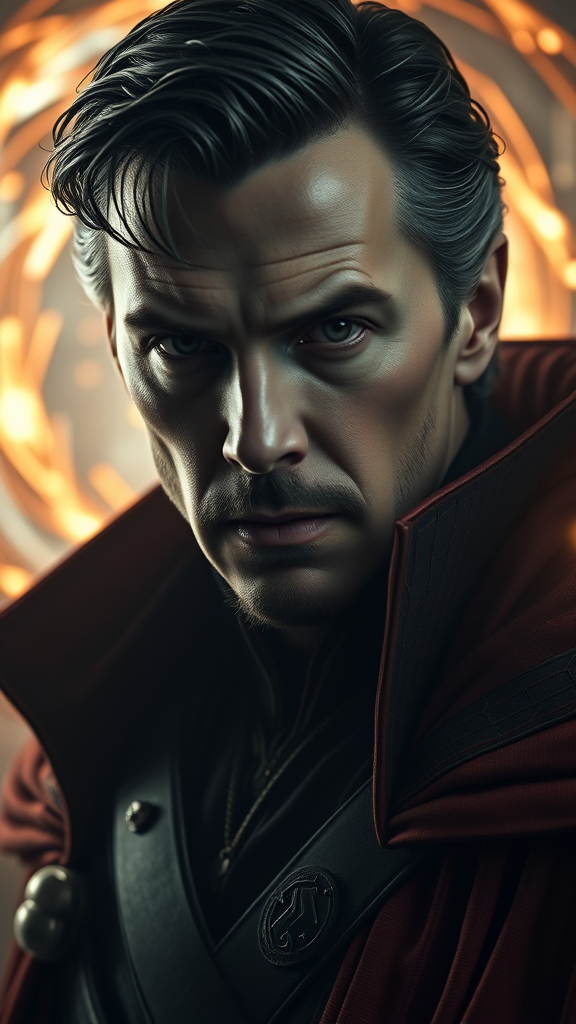 A stunning hyperrealistic photograph capturing Doctor Strange in a portrait, with dramatic cinematic lighting and astonishing detail; his expression is stoic and wise as a swirling, mystical portal glows in the background. This 8k masterpiece is blended with subtle blur effects to add depth and focus, rendered as if through the Unreal Engine, giving the scene a surreal yet intensely lifelike quality.