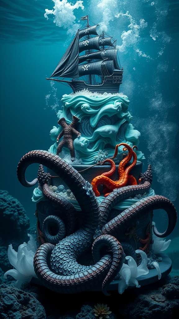 A stunning, hyperrealistic underwater scene showcasing a three-layered cake, each tier depicting a different oceanic environment, crowned with a meticulously detailed black pirate ship navigating through swirling mists. Below, a fearsome Kraken emerges with tentacles wrapping around the cake base, amidst an intricately designed and vividly colored universe diorama that captures the mysteries of the deep. The piece is brought to life with dramatic, immersive lighting that highlights the fine details and textures, employing advanced rendering techniques for a photorealistic effect, enhanced by an exquisite depth of field. Imagine the scene crafted with the power of an unreal engine, rendered in striking 8k resolution with an artful twist on the 9:16 aspect ratio.
