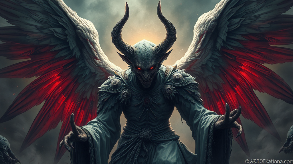 A stunning illustration captures the essence of a fallen angel imbued with the formidable powers of a sinister spirit, skillfully merging human and mythological beast features, and emanating an aura of mystery. The piece is detailed intricately, challenging the boundaries of reality, and set against a backdrop of a mystical entity that seizes control of human souls in an atmospheric wasteland. Striking contrasts enhance its otherworldly beauty, rendered in a style reminiscent of iconic artists like Julie Bell. The angel is adorned in elaborate, fantastical attire, heightening its allure, with ultra-realistic rendering achieved through advanced lighting and color grading techniques. The artwork is produced in gigapixel resolution, ensuring an extraordinary level of detail in 4K/8K/16K quality.