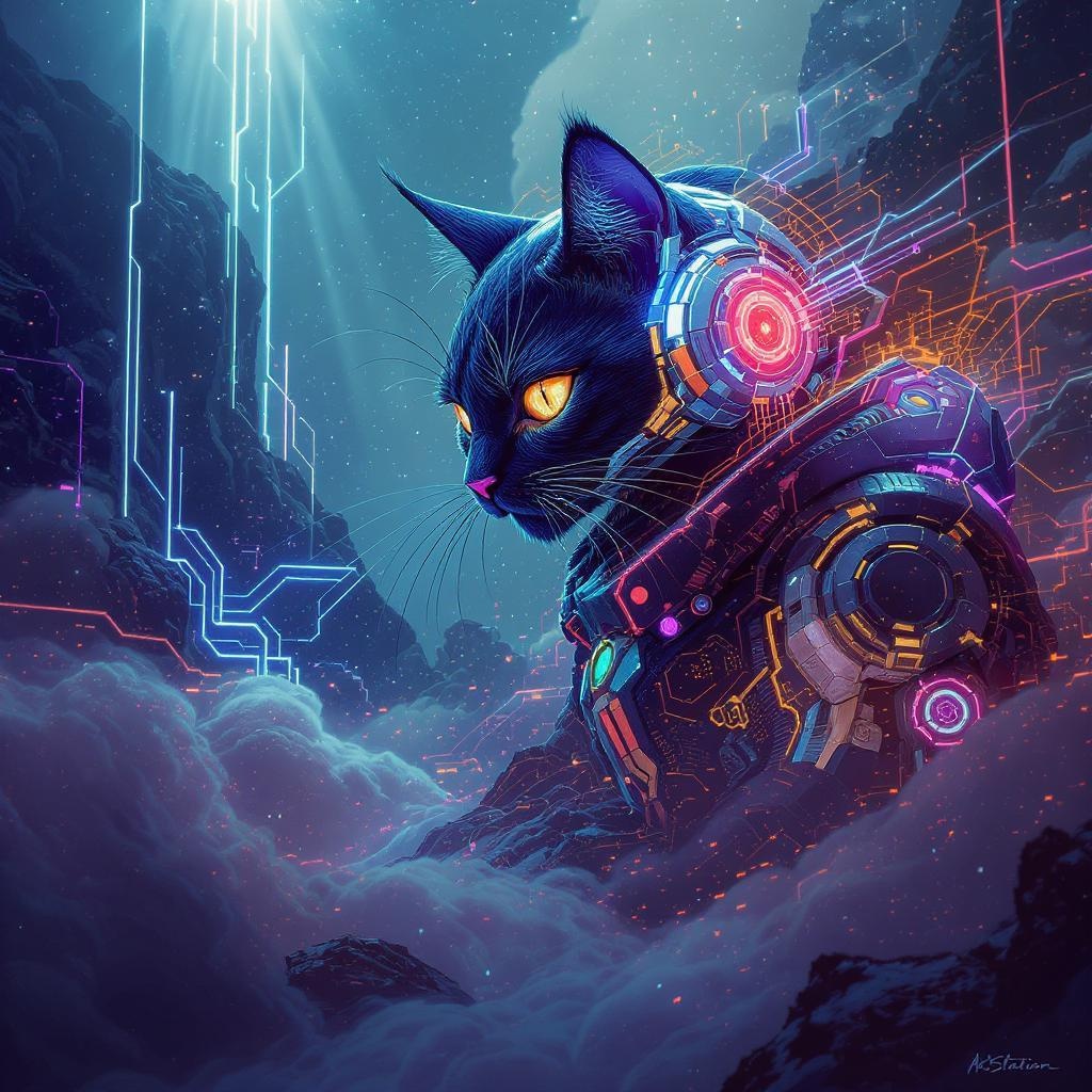 A stunning illustration depicting a feline hacker set amidst a futuristic cybernetic landscape, featuring a sharp-faced cat with an air of mystery and intelligence. The scene is enveloped in volumetric fog with ethereal godrays piercing through, creating a mystical atmosphere. The artwork bursts with vibrant and vivid colors, showcasing high saturation that highlights the intricate details of the feline's sleek, cyber-enhanced form. Inspired by the artistic styles of Greg Rutkowski, Jesper Ejsing, Raymond Swanland, and Alena Aenami, the composition takes a dramatic wide-angle perspective in a vertical orientation, adding depth and dynamism. The feline appears almost otherworldly, with an occasional double exposure effect hinting at multiple dimensions, embodying the essence of a master hacker navigating the complexities of a digital realm. Featured prominently on ArtStation, the piece emanates an aura of elegance and technological prowess, captivating viewers with its blend of beauty and sophistication.
