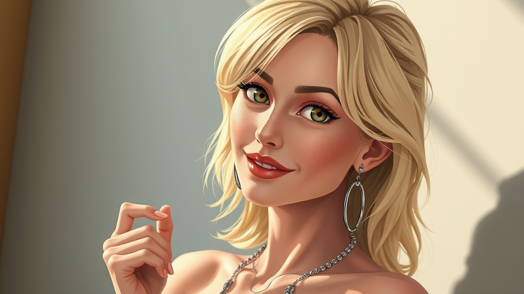 A stunning illustration of a 40-year-old woman with blonde hair, capturing her confident full body pose. The artwork showcases the essence of Leica 50mm and Hasselblad photography with exceptional quality and high resolution. The scene is bathed in beautiful lighting, emphasizing her textured and naturally imperfect skin. This anime-inspired, manga-style rendering features artistic elements with a touch of surrealism, offering exaggerated proportions and playful limbs, yet steering clear of any anatomy errors. The woman's big eyes and a hint of teeth peeking through a subtle smile add to her mystique. The cartoonish aesthetic is balanced by a mature presence, and intricate jewellery details add a touch of elegance to her picture-perfect expression.