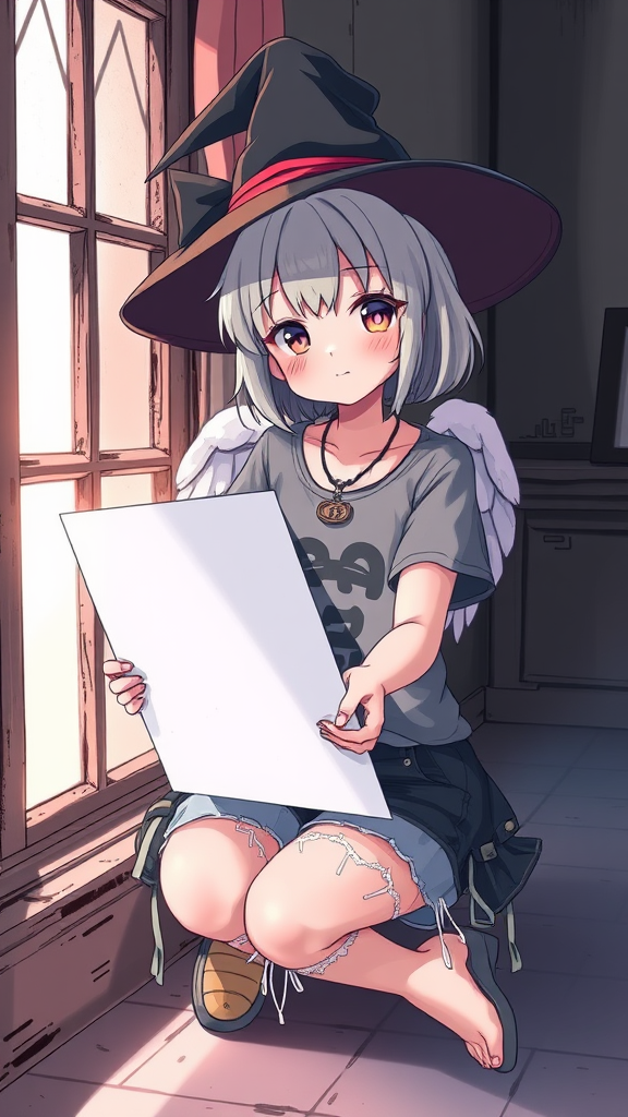 A stunning illustration of a cute female angel with a sweet anime-like face and sheer blush cheeks, sitting by the window in an old room. She holds a sheet of the plate in her outstretched hands, dressed in casual punk-style attire. Her ensemble includes a punk-style T-shirt and torn leg clothes, complemented by a translucent witch hat. She exudes a charming and ethereal presence, with her focus solely on the task at hand. The artwork is rendered in high saturation and 8K resolution, capturing the volumetric lighting that bathes her in a soft, enchanting glow. The scene highlights her pretty face and captivating expression, embodying a perfect blend of punk and fantasy elements.