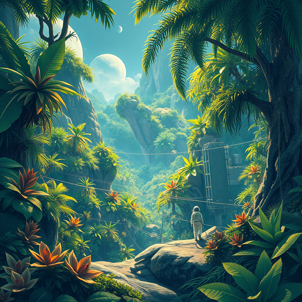 A stunning illustration of an astronaut exploring a lush, verdant world, showcasing a masterpiece of sci-fi artistry with atmospheric depth. Highly detailed and in sharp focus, the scene is intricately composed, capturing the vibrant flora and exotic landscapes in breathtaking 4k resolution. Trending on art platforms, this artwork offers imaginative embellishments, with subtle futuristic elements and a unique perspective, inviting the viewer to get lost in the beauty and mystery of this otherworldly environment.