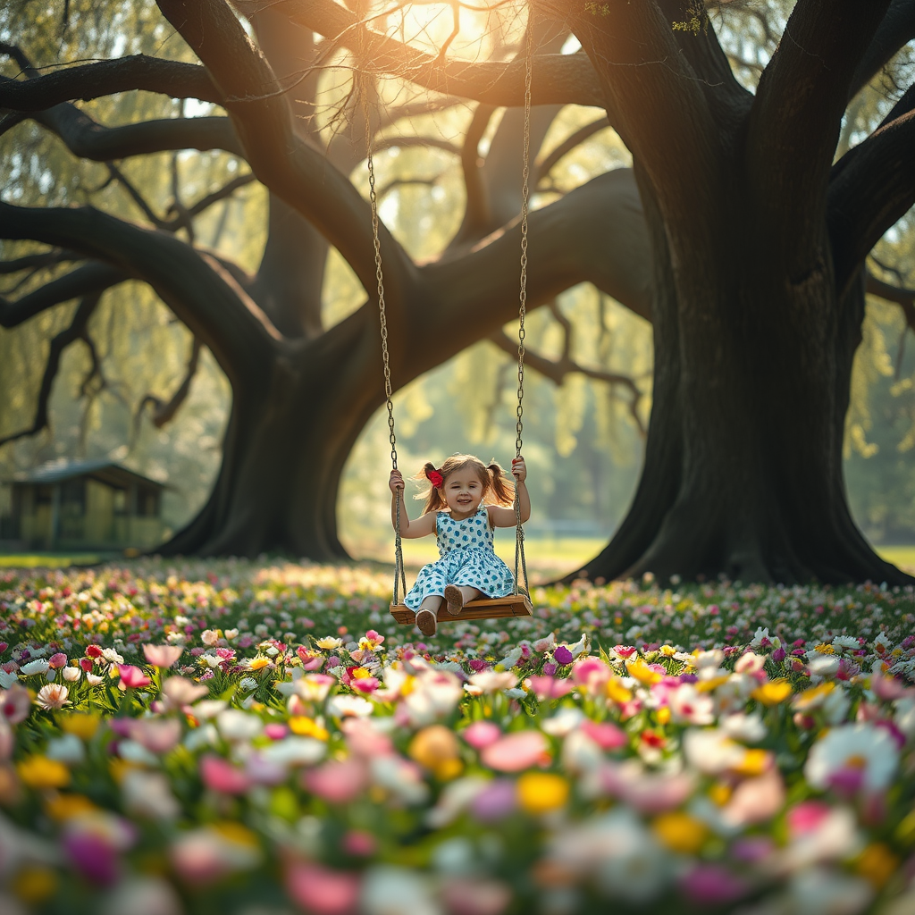 A stunning image captures a young girl joyfully swinging under a massive tree, enveloped by a vibrant sea of spring flowers. The scene is enhanced by soft, enchanting volumetric lighting. The composition maintains high quality and beauty, capturing the essence of a peaceful, dreamlike landscape.