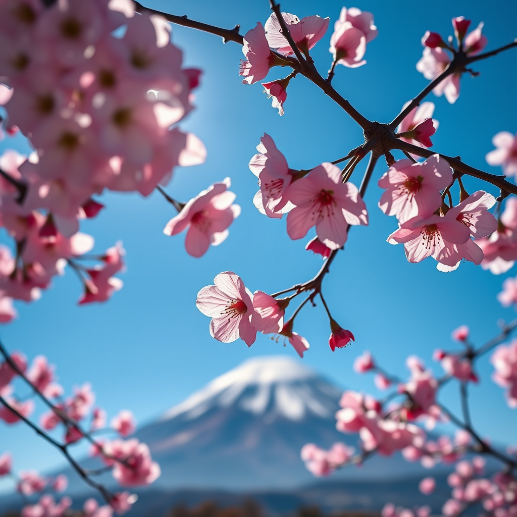 A stunning image capturing cherry blossoms in full bloom with the iconic Mount Fuji rising gracefully in the distance, reminiscent of Takashi Komatsubara's unique style. The exquisite composition highlights the fragile beauty of the cherry blossoms in intricate detail. The pink petals shimmer under the crisp morning light, vividly contrasting with the rich azure sky and Mount Fuji's pristine snow-capped summit. Taken with a Canon EOS R and a 70-200mm f/2.8 lens, the shot uses carefule settings: an aperture of f/4.5, ISO 100, and a shutter speed of 1/1600 sec, to achieve perfect exposure and clarity. Post-processing subtly refines the image, with precise adjustments to color balance, contrast, and saturation, creating a captivating and indelible masterpiece. Ultra-detailed, Super-Resolution, UHD, DTM, HDR, 8K --ar 3:2 --q 2.
