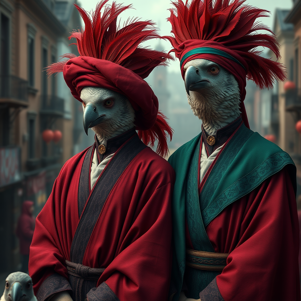 A stunning image capturing two individuals adorned in elaborate cloth hats and flowing robes, reminiscent of realistic animal portraits. Created with the detail and depth of Unreal Engine and infused with the spirit of neo-renaissance art, their attire is lush in maroon and emerald tones. The scene is avian-themed, set against the backdrop of a richly detailed cityscape, highlighting the charm of these intriguing characters. The mood is vibrant and immersive, blending the timeless elegance of classic portraiture with modern digital art sensibilities, presenting a harmonious blend of tradition and innovation.
