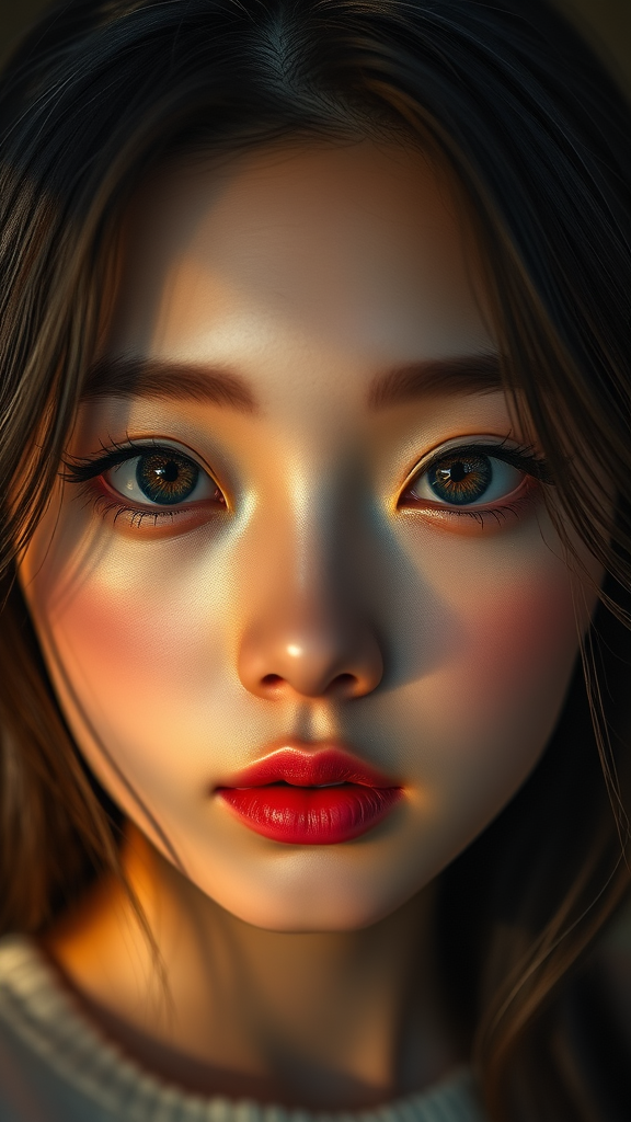A stunning image featuring a beautiful Korean girl with exquisitely detailed, symmetrical eyes, captured under dramatic lighting. The scene boasts rich colors and hyper-realistic lifelike textures, reminiscent of professional high-resolution photography. Using an f1.6 lens, the image emphasizes high contrast and hyperrealism akin to an 8K CG wallpaper. The portrayal is realistic, with physics-based rendering to enhance the beauty and intricacy of the subject. The raw color photo reflects the vivid details and realistic texture without any distracting elements such as text or logos, ensuring an aesthetically pleasing composition. Minor skin imperfections like spots or blemishes add authenticity to the image, while complex issues like deformed or cloned features are notably absent, maintaining the overall harmony of the portrait.