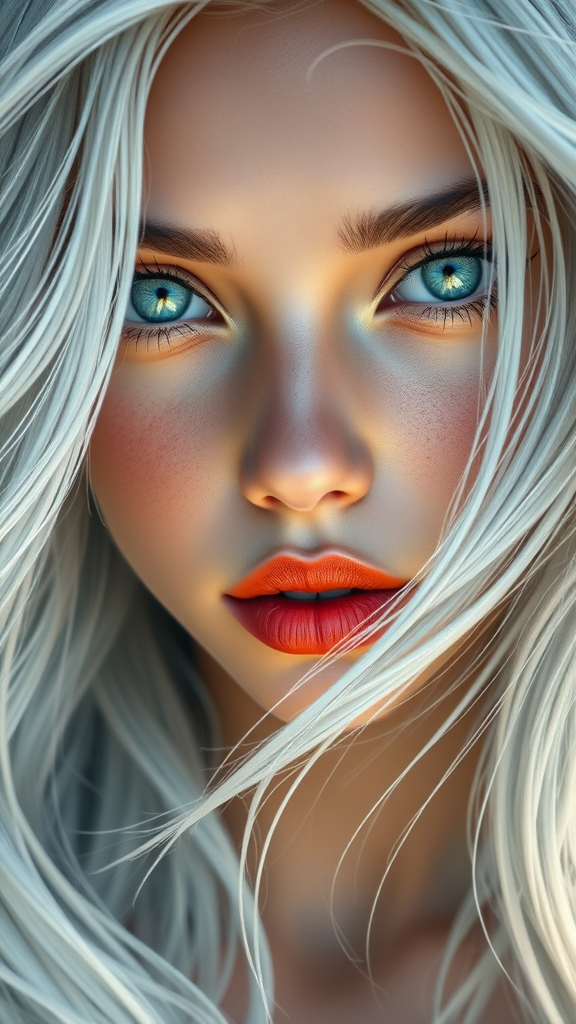 A stunning image of a girl with flowing white hair, captured in a style reminiscent of Ross Tran's vibrant, dynamic art. Her eyes sparkle with a mix of light teal and dark orange hues, creating a mesmerizing contrast. The composition combines the close-up intensity seen in Guido van Helten's murals with the fluid, detailed realism of marine paintings. The artwork embodies a blend of comic art and animated gifs, where every strand of hair and every feature is meticulously detailed. This imaginative portrayal balances stylized creativity with the expressive charm of animated storytelling, set against a backdrop that highlights her ethereal presence.