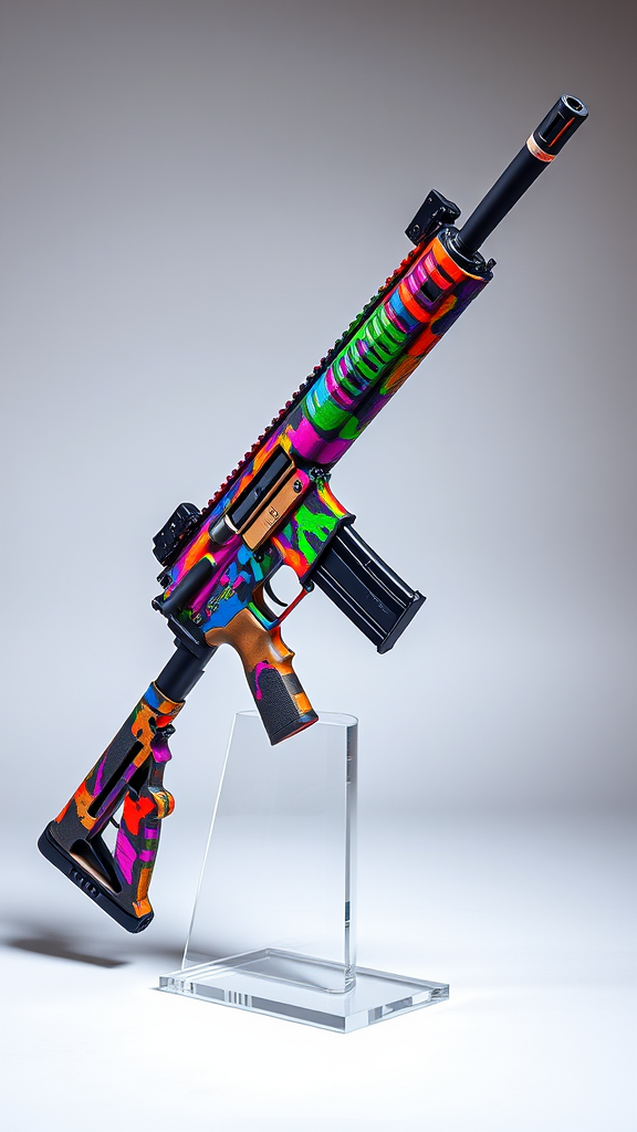 A stunning image of an AR15 rifle transformed into an art piece, vividly adorned in bright, psychedelic colors. This ArmaLite AR-15 stands as a commanding art display, captured resting on a contemporary acrylic stand. The piece is designed to evoke thought, showcasing the rifle and magazine in eye-catching psychedelic camouflage. Shot in a professional photography studio, the photo employs a neutral light background. The composition skillfully contrasts the weapon with its vibrant colors, sparking contemplation on themes of conflict and harmony. Professional studio lighting enhances the image with diffused light and a soft bokeh effect. Captured at a 45-degree angle close-up using a Sony A7S III with a 35mm lens, the image boasts an ISO of 100, low shutter speed, and f4 aperture. This high-quality digital photograph is a perfect blend of professional product photography, free of text, signatures, or any distracting elements.