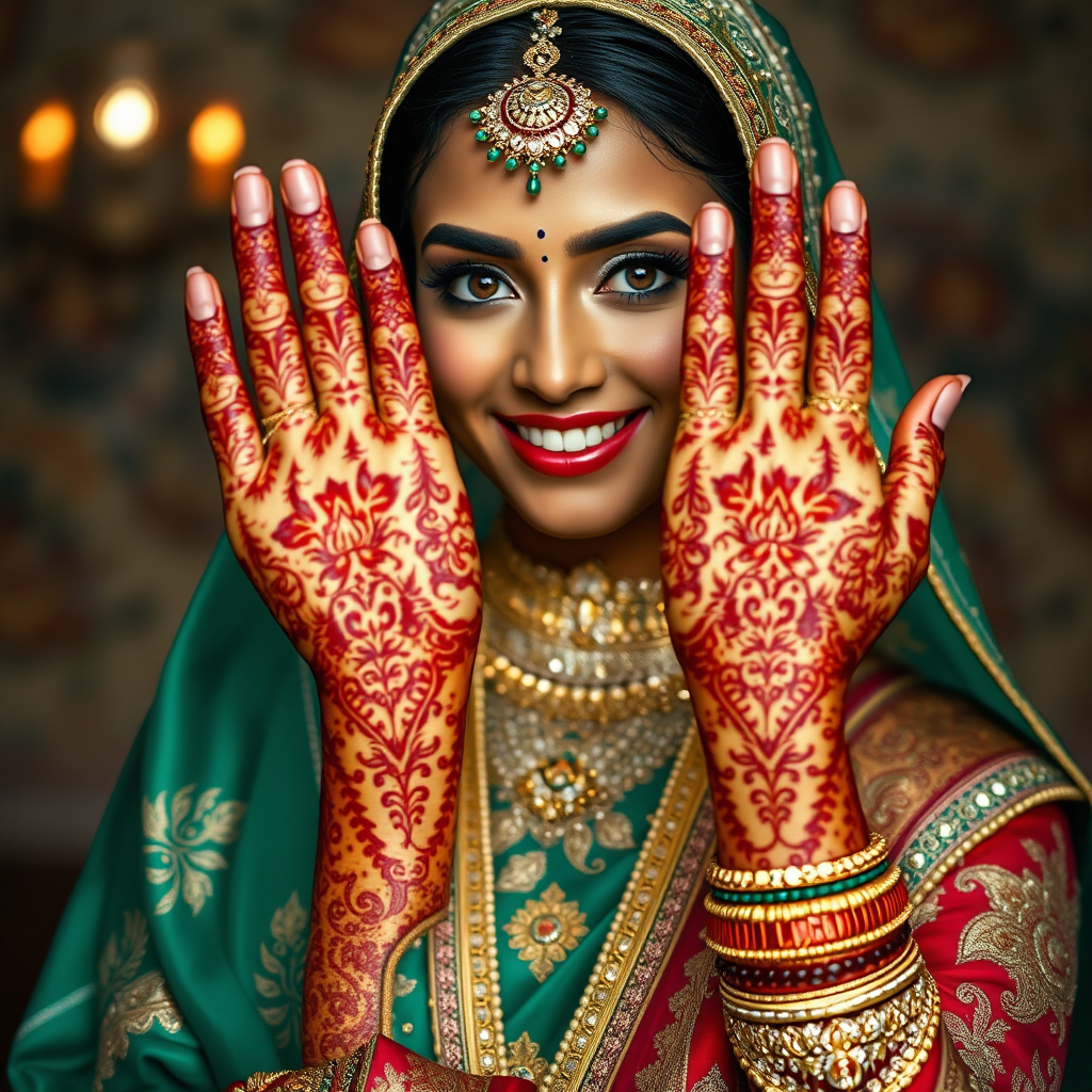 A stunning Indian bride adorned in exquisite traditional attire showcasing her intricately designed henna-covered hands, rendered in a photorealistic, ultra-detailed, hyperrealistic style. Captured through a wide-angle lens with high-contrast shading on 70mm film, the scene is enriched with Indian-inspired motifs. The color palette features deep amber and lush emerald, alongside dark turquoise with earthy brown tones. Bright orange contrasts with rich emerald accents, while bold crimson pairs elegantly with hints of turquoise. The image is delivered in high definition, capturing every fine detail of the bride's radiant expression and elaborate embellishments.