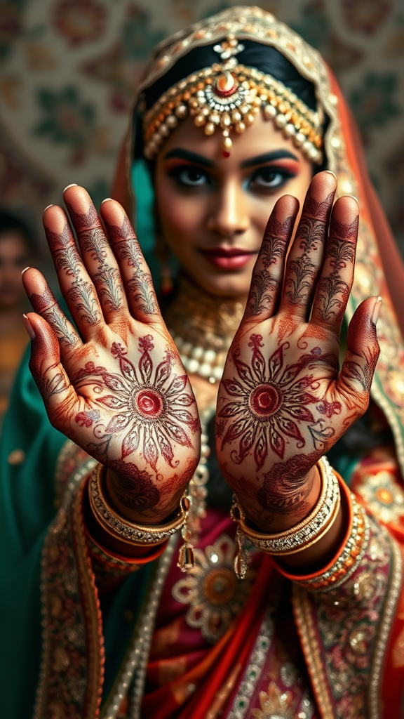 A stunning Indian bride adorned in exquisite traditional attire, presenting her hands adorned with intricate henna designs, showcasing photorealistic, ultra-detailed, and hyperrealistic imagery captured through a wide-angle lens. The scene is enriched with high-contrast shading and shot on a 70mm film to emphasize the magnificence of Indian-inspired motifs. The palette features a harmonious blend of deep amber and emerald, rich turquoise and brown, alongside striking shades of orange and emerald, with a touch of red and emerald, and dark crimson and turquoise. The focus is on high definition detail, inviting viewers into a vivid world of cultural elegance and beauty.