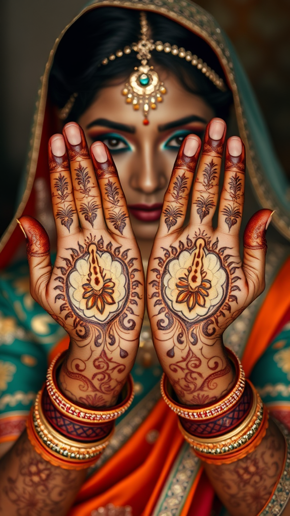 A stunning Indian bride adorned in traditional attire, elegantly displaying her hands with intricate henna designs, captured in a photorealistic and ultra-detailed manner. The scene is shot with a wide angle lens on 70mm film, emphasizing high-contrast shading. Indian-inspired motifs are woven throughout, with an exquisite palette of dark amber and emerald, rich turquoise and earthy brown, vibrant orange and emerald, and deep crimson blended with turquoise. The image boasts high definition, showcasing exceptional clarity and depth.