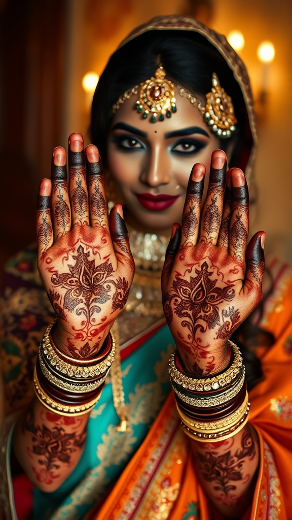 A stunning Indian bride adorned in traditional attire, elegantly displaying her intricately designed henna-covered hands, captured in photorealistic detail with ultra-detailed and hyperrealistic features. The scene is shot with a wide-angle lens, emphasizing the high-contrast shading in high definition, reminiscent of a 70mm film. Her outfit is adorned with Indian-inspired motifs, featuring a rich palette of dark amber and emerald, deep turquoise and brown, vibrant orange and emerald, and striking red and emerald. Hints of dark crimson and turquoise add to the vividness of the ensemble. The atmosphere is imbued with a sense of elegance and grace.