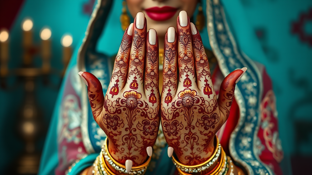 A stunning Indian bride draped in exquisite traditional attire showcases her intricately adorned hands with elaborate henna designs, captured in photorealistic detail. The image features ultra-detailed textures and hyperrealistic qualities, shot through a wide angle lens that enhances the beauty of the scene. High-contrast shading accentuates the traditional Indian-inspired motifs, with a palette of rich dark amber and emerald, deep turquoise and brown, vibrant orange and emerald, as well as the striking combination of red and emerald, set against a backdrop of dark crimson and turquoise. The scene is brought to life in high definition, with the focus on the elegance and cultural richness of the Indian bridal tradition.